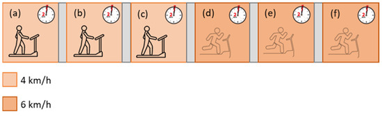 Laboratory test protocol (after initial recording at rest): exercises on treadmill, at two different velocities, namely 4 km/h (a–c) and 6 km/h (d–f).
