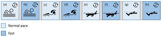 In-water test protocol (after initial recordings at rest): free-style (a,b), butterfly (c,d), backstroke (e,f), and breaststroke (g,h) laps, at two diverse paces (normal and fast).
