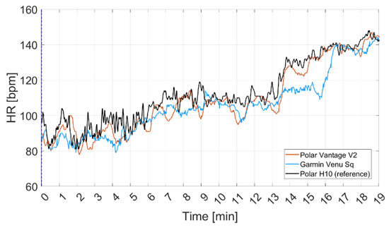 An example of the time series of the signals acquired by the three different sensors is reported in Figure 4 (dry conditions). It is possible to see that agreement between test and reference device is affected by activity (increasing over time, according to the test protocol, see Figure 2).