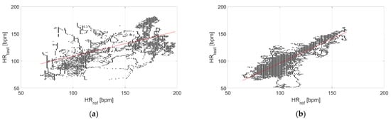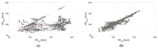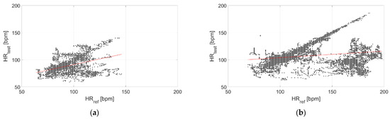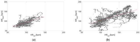 - Correlation analysis: the Pearson’s coefficient (ρ) was computed to assess the linear correlation between the tested device (smartwatch) and the reference one (cardiac belt). The strength of the relationship was considered high when ρ > 0.7, moderate when 0.3 < ρ < 0.7, and low when ρ < 0.3 [42]. Additionally, the interpolating curve was considered to verify the linearity of the relationship.