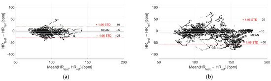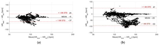 Bland–Altman plot related to (a) In-water and (b) Dry acquisitions, including recordings both at rest and during moderate physical activities performed with Garmin Venu Sq (reference instrument: Polar H10).