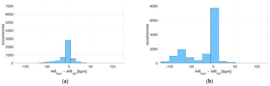 The deviations with respect to the reference instrument are reported in Figure 7 and Figure 8 for Garmin Venu Sq and Polar Vantage V2, respectively. It can be noted that the distribution is much narrower when tests are performed in dry conditions, since the standard deviation of the distribution is very lower (7 bpm vs. 37 bpm for Garmin Venu Sq, 12 bpm vs. 30 bpm for Polar Vantage V2). Moreover, for Garmin Venu Sq, the distribution of deviations for in-water recordings seems almost bimodal. Water has a deteriorating effect on the metrological performance of the tested devices, both in terms of precision and accuracy.