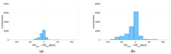 Distribution of deviations related to (a) In-water and (b) Dry acquisitions, including recordings both at rest and during moderate physical activities performed with Polar Vantage V2 (reference instrument: Polar H10).