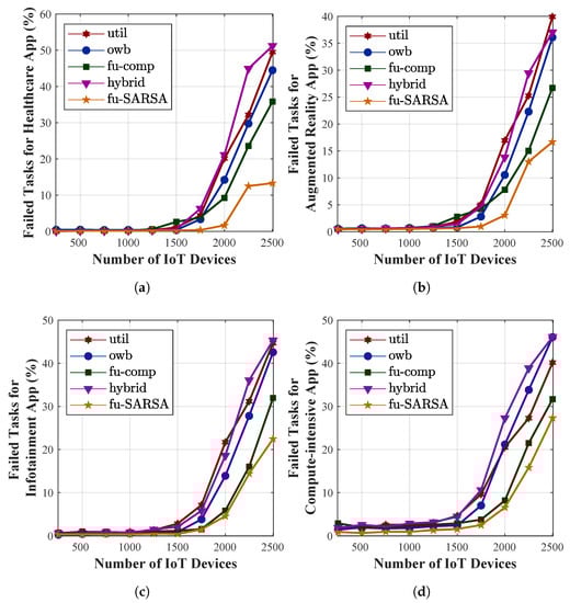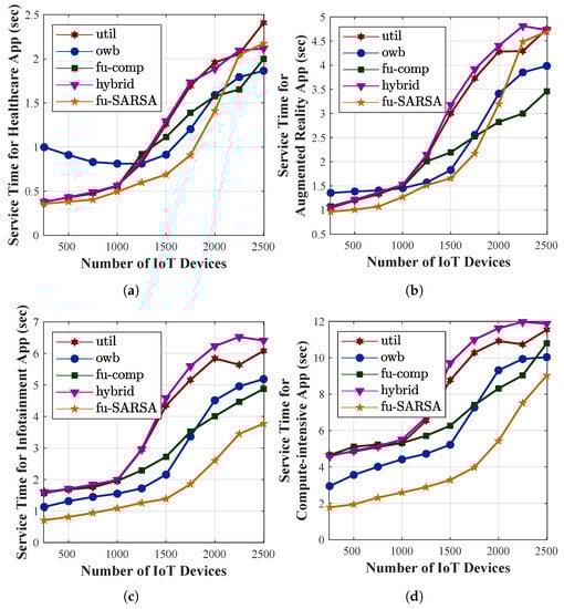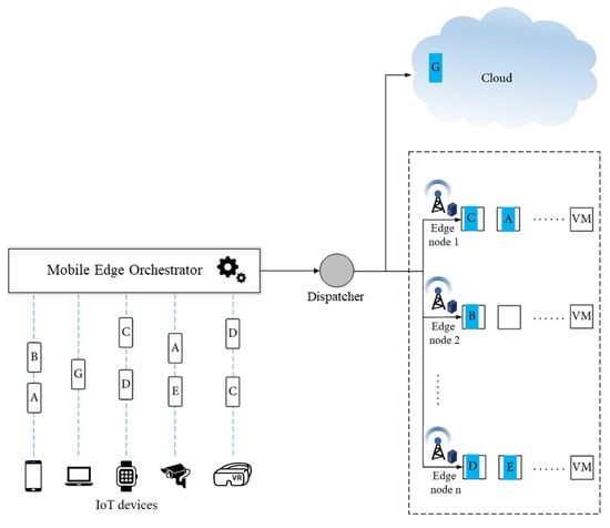 In recent years, the development of heterogeneous fifth-generation (5G) networks has led to the rapid evolution of modern high technologies and has changed people’s daily lives by providing various high-demand and intensive applications (e.g., virtual/augmented reality (VR/AR), the internet of vehicles, mobile healthcare, cloud gaming, face/fingerprint recognition, industrial robotics, video streaming analysis, and autonomous driving) [,,]. These applications generate a vast amount of data and require a fast response time and large resource capacities. Consequently, there is a significant burden on resource-constrained IoT devices to handle these heavy computational demands and to accomplish requests quickly. However, these devices are insubstantial with regard to their battery life, computing capabilities, and storage capacity, and are ineffectual when performing a high number of intensive tasks []. Therefore, it is crucial to offload the tasks to other powerful remote computing infrastructures.