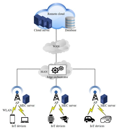 In conventional cloud computing, mobile cloud computing (MCC) is a prominent model, supporting computational offloading for mobile devices []. By taking advantage of the enormous computing capabilities of MCC over a wide area network (WAN), user devices can send requests to powerful global cloud servers to utilize their rich computational resources for task processing. However, the long distance between the devices and core network in the MCC network not only causes high transmission delays, data losses, and significant energy consumption, it also limits the context-awareness of applications []. As a result, MCC is unable to meet the standard requirements of delay-sensitive and real-time applications in heterogeneous IoT environments.