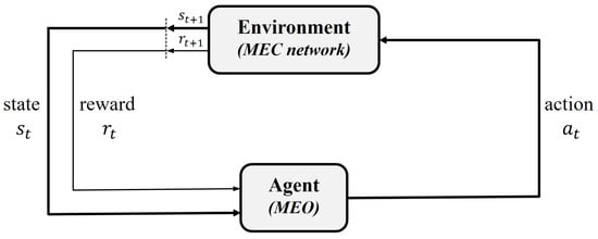 Reinforcement learning supports the software agents in intelligently deciding upon the best action in a particular state of the environment, in order to maximize their performance. Therefore, in this phase of our proposed algorithm, we determine the best neighboring edge server for task offloading using one of the reinforcement learning-based methods, that is, SARSA learning. The agent–environment interaction in our system is described in Figure 4. The MEO takes responsibility as a decision-maker in the MEC network. When the MEO receives the request from a task for an offloading decision, it is considered an agent which needs to choose the best offloading action for that task. The task offloading scenario occurs in the IoT heterogeneous MEC network; therefore, the parameters in the MEC refer to the environment for the agent. We precisely describe the SARSA-supported task offloading algorithm in Section 5.