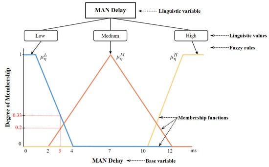 An example of a linguistic variable with linguistic values and a set of membership functions—specifically, the variable of MAN delay—is depicted in Figure 5. As an example, we assume that the crisp input parameter of MAN delay  is 3 ms. The value of the left-shoulder membership function is . To calculate the value of , we determine the range value of crisp variables based on the range column in Table 2 and apply the Formula (6). Therefore, the values of a, x, and b will be 1, 3, and 4, respectively. As , the value of  is equal to . Similarly, the values of a, x, and b for the right-shoulder membership function are 10, 3, and 13. Since , . The last membership function  has a triangular shape. We use the values of x, a, b, and c (i.e., 3, 2, 7, and 12) to calculate the value of , which is equal to 0.2. As a result, the values of membership functions with corresponding low, normal, and high linguistic values are calculated, which are , 0.2, 0, respectively, and . We define the set of membership functions as each input variable of the first and second FLSs in Figure 6 and Figure 7.