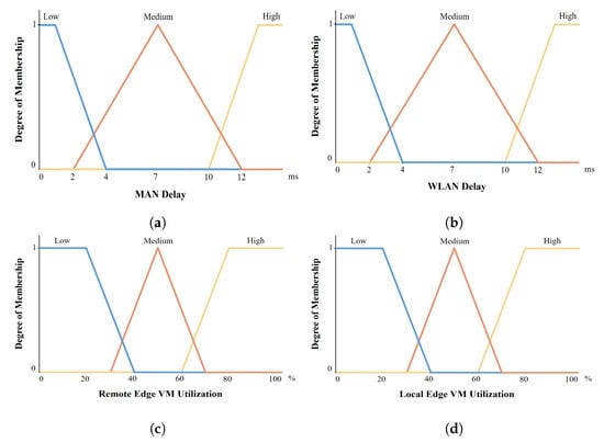 Set of membership functions for each input variable in the first FLS: (a) WLAN delay. (b) MAN delay. (c) Local edge VM utilization. (d) Remote edge VM utilization.