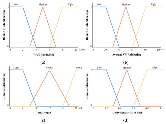 Set of membership functions for each input variable in the second FLS: (a) WAN bandwidth. (b) Average VM utilization. (c) Task length. (d) Delay sensitivity of the task.