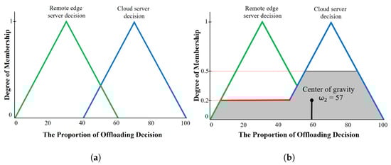 The membership function for offloading decisions is shown in Figure 8a. We assume that the values of inferred fuzzy outputs  and  are 0.5 and 0.2. Applying Equation (15), the result of crisp output  will be approximately 57, as shown in Figure 8b. Based on the value of the output result, the MEO decides to send the task to the cloud.