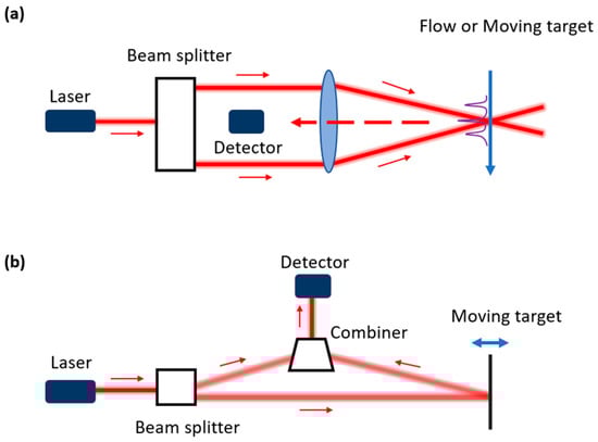 Schematic diagram of laser Doppler sensors using external interference (a) and internal interference (b). The external interference is usually used in laser Doppler velocimetry and the internal interference is usually used in laser Doppler vibrometry.