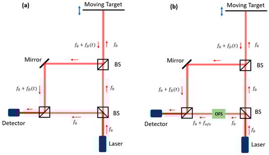 Schematic diagram of (a) homodyne interferometer and (b) heterodyne interferometer. A beam splitter (BS) creates the reference and measurement arms of the interferometer. The heterodyne interferometer has an optical frequency shifter (OFS) in the reference arm. One can also use polarization beam splitters and quarter-wave plates in the LDV system to improve the coupling efficiency of reflection and the isolation of the laser source. However, they are not mentioned in the plotted system in this figure to simplify the schematic of the system.