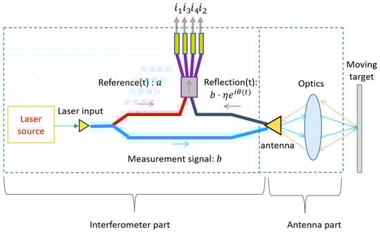 In many homodyne systems, a so-called 90° optical hybrid is used as the combiner to discriminate the movement sense (forward or backward) of the target []. The working principle of this method is briefly explained in the following part. When a measurement signal and a reference signal are combined in a typical 90° hybrid, four optical outputs will be generated, and they can be expressed as follows: