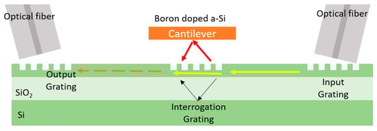 Schematic of an SOI-based vibrometer measuring a cantilever on top of the sensor grating.
