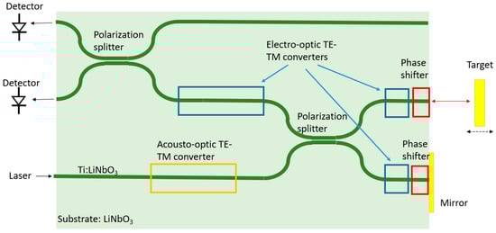 Other demonstrations used the acoustic-optical properties of LiNbO3 to realize a heterodyne interferometer [,]. A schematic as shown in [] is depicted in Figure 9. In these demonstrations, on-chip electrodes are used to excite surface acoustic waves (SAW) to realize an acoustic-optic TE-TM converter that distributes the power of the initial TM-mode into both TE and TM modes. The TE mode of this converter has a frequency shift agreeing with the acoustic frequency. TE and TM modes are separated in a subsequent polarization splitter forming both the reference and measurement arms of the interferometer. Hereafter, electro-optical TE-TM mode converters are used to rotate the back-reflected waves by 90° without an additional frequency shift. Thanks to this additional polarization conversion, the reflected light signals are all coupled into the output arm of the polarization splitter rather, and very limited power is sent back to the laser source. Since both waves are orthogonal in the output arm, an additional TE-TM converter was used to generate interfering polarization components, which are separated in the subsequent polarization splitter, after which the two polarization components proceed to different photodetectors. Light in the measurement arm was reflected by the target white light in the measurement arm is reflected from a terminating mirror; therefore, the photodetectors detect the intensity modulation induced by the frequency shift of the acoustic-optical frequency shifter and the vibrating target frequency. The reported resolution is 105 pm with a 3 kHz detection bandwidth.