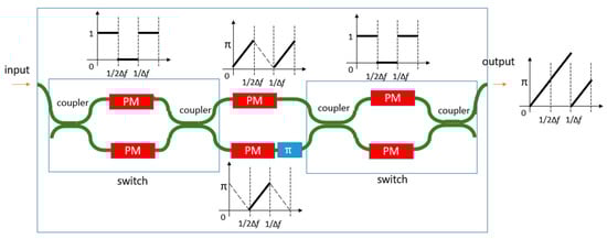 The SOI platform also has a high-speed phase modulator (PN junction). However, the phase modulator has spurious absorptions during modulation []. Therefore, spurious harmonics exist when the waveguide is modulated with a serrodyne technique. Some methods can be used to remove the spurious harmonics. One method is the single-sideband suppressed-carrier (SSB-SC) modulation method. In this method, the light is split into different branches with a phase modulator in each of them. By using the difference in the phase relation of the different harmonics, additional phase modulators in each branch are used to cause positive interference for a single harmonic. A schematic depiction of such a system based on a four-branch phase modulator array is observed in Figure 10. Based on this frequency shifter, Cole et al. demonstrated a heterodyne LDV in the SOI platform []. It shows a sideband suppression of over 15 dB. However, the generated optical frequency shift is only at 50 Hz. There is also a strong distortion in the demodulated signal, which may suggest that the sideband suppression is still not enough in the demonstrated device. Another method to generate a frequency shift is to use a switch serrodyne technique [] on a PN-junction-based phase modulator, as seen in Figure 11. In this technique, the entire 2π phase shift in a serrodyne period is split and sent to two separate phase modulators, each of which only generates a π phase shift. To connect the two-phase modulations in the time domain, a fast-switching circuit controlled by another PN junction-based phase modulator is used to switch the optical signal from one phase shifter to another. Meanwhile, a constant π phase shift is applied to one of the arms using the thermo-optic effect to ensure the phase modulation is continuous after switching. In this case, the spurious amplitude modulation associated with a large phase modulation will be strongly suppressed. It is reported that the side-band suppression can reach 36 dB.