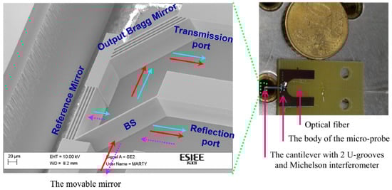 - Malak, M.; Marty, F.; Nouira, H.; Vailleau, G.; Bourouina, T. All-silicon Michelson instrument on chip: Distance and surface profile measurement and prospects for visible light spectrometry. Appl. Phys. Lett. 2013, 102, 141102. [Google Scholar] [CrossRef]
