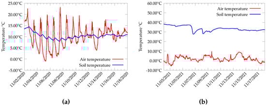 Soil and air temperature data collected from (a) Campus Drie Eiken of University of Antwerp in Belgium for the month of November 2020. (b) Forhot site in Iceland for the month of November 2021.