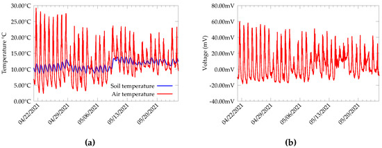 Data from test bed deployed in the CDE campus of University of Antwerp during April 2021. (a) Soil temperature (TEG cold side) and air temperature (TEG hot side). (b) TEG open circuit voltage.