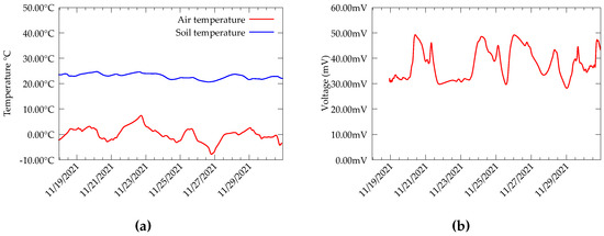 The data collected from the Forhot site present a more interesting dataset due to the fact that the soil there is geothermally active. Additionally, the variation in soil temperature with diurnal variation is very low; the soil at different plots is warmed to a different temperature. At present, there are plots identified with a temperature of 0–50 °C [12]. During the experiments, the hot side of the TEG was attached to the copper rod and the cold side was connected to the heat sink. We collected data from a plot, which was warmed to 20 °C at 10 depth. Temperature measurements and TEG open-circuit voltage are presented in Figure 4.