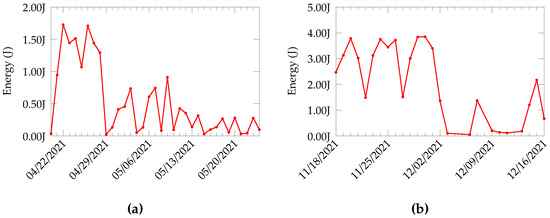Figure 5a shows the harvested energy calculated from the CDE data. The simulation predicts a maximum of 1.8 J. However, blackout days where the energy level is considerably low are present. For instance, on 29 April, the energy produced is almost zero. This is also visible in the open-circuit voltage data. The average energy produced for the experiment duration is 498.91 mJ, whereas the data produced from the Forhot site, shown in Figure 5b, have a near-consistent energy production, with an average of 2.017 J, over the whole experiment. Based on these energy values, we can observe that the thermal harvesting system, both in CDE and Forhot, can power a DASH7 node without trouble. The DASH7 node consumes only 11.5 mJ for the transmission of a packet [24].
