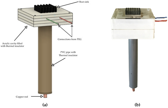 The energy converter unit is designed to harvest the maximum amount of energy by providing an efficient heat transfer between the hot and cold sides of the TEG. We follow a traditional design, where a TEG is sandwiched between a copper rod and a heat sink. The hot side makes contact with the ambient air through a heatsink. We used the heat sink ATS-55300K-C1-R0 from Advanced Thermal Solutions Inc and the TEG module TG12-4-01LS from Marlow Industries. The TEG has a dimension of 300 × 340 mm. To ensure minimum thermal resistance, the interface between the heat sink and TEG module was sealed with thermal paste. The cold side of the TEG was connected to a copper road of 6 in diameter and 15 cm in length. The copper rod acts as a heat sink or source depending on the hot-side temperature. Copper was chosen as the heat tube due to its high thermal conductivity. The cold-side-copper interface was connected with thermal paste. The copper rod was further covered with a PVC pipe filled with a thermal insulator. Only 2 portion of the copper rod was exposed to the outside. This was performed to ensure that the copper rod does not come into contact with the upper soil layers, where the temperature fluctuations are high. The TEG module was then enclosed in a hollow enclosure made with acrylic. The heatsink and copper rod extended to the outside environment, as shown in Figure 6. The internal cavity of the acrylic enclosure was filled with thermal insulators to ensure minimal heat flow through the walls.