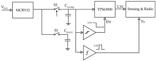 In addition to the main storage capacitor, we used a 500 μF capacitor as a bootstrap capacitor (CBOOT). The voltage from this capacitor was used to power the comparators and provide them with stable reference voltage. The bootstrap capacitor further controls the charging of CSTORE through the switch S2. S2 is an ultra-low, quiescent current load switch SiP32431 [34] from Vishay Semiconductors. SiP32431 has a quiescent current of 10 and leakage current of 200 . The active high enable input of SiP32431 is controlled by VBOOT. This bootstrap system ensures that the comparator circuits obtain a stable reference voltage independent of CSTORE.