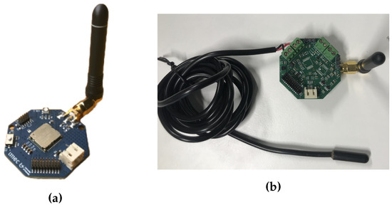Sensing and radio unit (a) Dash7 radio module. (b) Sensing unit connected to Dash7 radio module.