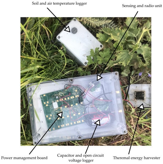 The energy-harvesting unit, along with additional data loggers to monitor system performance, was installed in the CDE campus for real-life evaluation. A block diagram of the whole experiment setup is depicted in Figure 10. We collected data from the energy harvesting device for around a month starting from 1 March 2022 to 12 April 2022. The data loggers measured supercapacitor (CSTORE) voltage every one minute, along with the temperatures, and forwarded this information to a DASH7 gateway installed in the site. The gateway then used MQTT to disseminate these data to the cloud. The collected data can be viewed on a web-dashboard in real-time. A picture of the installation is shown in Figure 11. The power management unit continuously monitored the capacitor voltage and enableed the sensing and transmission unit when the voltage reaches the higher threshold value (3.3 V). The DASH7 transceiver module on the unit disseminated the transmitted packet.