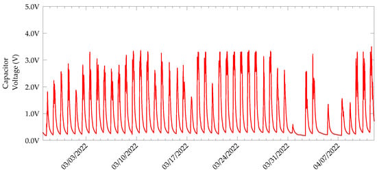 The daily charging-discharging cycles of the supercapacitor are shown in Figure 12 and those used for a single day are depicted in Figure 13. The discharge curves in the daily cycle are due to sensing and transmission unit activities, as well as the self-discharge of the supercapacitor.