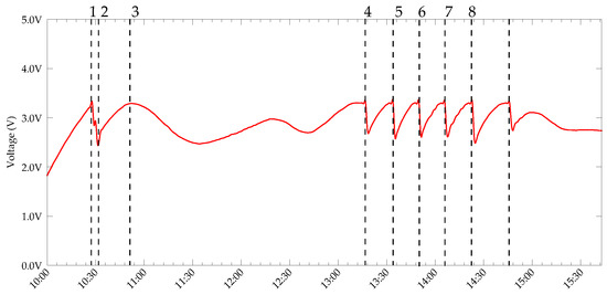 As stated already, the sensing and radio unit was only turned when the capacitor voltage reached 3.3 V. Then, a sensing task, followed by a DASH7 transmission, were executed. State 1 in Figure 13 shows an instance of sensing and transmission. Further, State 2 represents a situation where the voltage across the capacitor is below the higher threshold. Therefore, only the switching regulator is active. Along with the switching regulator’s quiescent current, the leakage current of the capacitor contributes to the discharge. States 3–8, again represent sensing, packet transmission and subsequent capacitor charging and discharging processes.