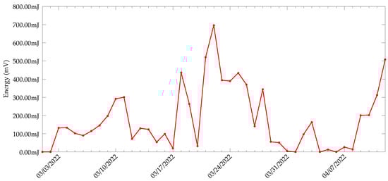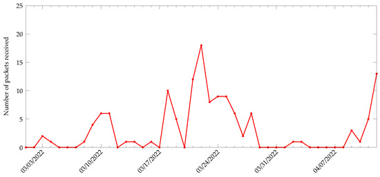 Number of packets received per day from the energy-harvesting node during the period from 1 March 2022 to 12 April 2022.