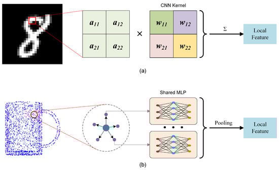 Figure 1a. When performing MLP-based point cloud analysis, shared MLP is usually implemented with a 1 × 1 convolution kernel, which is equivalent to forcing the weights of the convolution kernels corresponding to each position in the local area of the 2D image to be the same. Thus, the feature extraction is independent of the relative position of the pixels, which seriously weakens the feature extraction ability of the convolution kernel, see