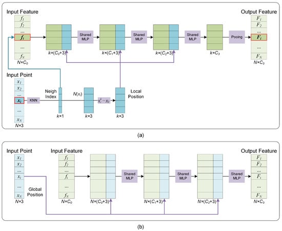 Figure 4a,b correspond to the Fusion Modules with the local and global perception fields. The main difference between the two modules is that the Fusion Module with local perception fields needs to explore the neighborhood points through kNN operation and then calculate the relative coordinates, and the Fusion Module with the global perception field only needs to provide the global coordinates directly.