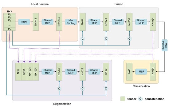 Figure 6, the entire network mainly consists of three modules, which are used to extract the local features, fuse the local features with the supplementary global coordinates to obtain shape-level features, and perform classification or segmentation tasks, respectively. The classification network and segmentation network share the same first two modules.