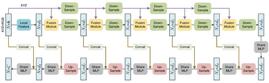 In addition to the initial Local Feature Module, the semantic segmentation network mainly includes five Fusion Modules followed by down-sampling operations and five subsequent up-sampling operations. Such a design is beneficial for reducing the amount of computation and extracting more abstract features. The entire network structure is shown in