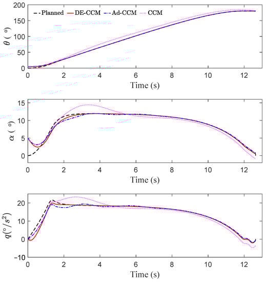 where , and q are the pitch angle (in rad), angle of attack (in rad), and pitch rate (in rad/s). Here and are aerodynamic lift and moment, respectively. Using the flat plat theory, these two aerodynamic terms are approximated by and with unknown parameters and . For all the simulations, the true values are chosen to be , , while the nominal values of these parameters used in designing all the tested controllers are limited to , . As a result, the dynamics can be recast in the form of (30) with , and . The control objective is to drive the system from nominal initial states to terminal states . For CCM search and trajectory planning, the following constraints are enforced: s, /s.