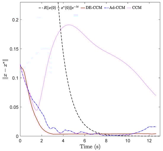 As shown in Figure 2 and Figure 3, due to ignoring the uncertainties, CCM yielded a large tracking error between 2 and 6 s. The state trajectories under Ad-CCM had some oscillations, which lasted roughly up to 8 s. All three states yielded by DE-CCM achieve good tracking performance without large deviations from the planned trajectories, unlike the performance yielded by Ad-CCM and CCM. From Figure 3 we notice that the tracking error represented by under DE-CCM monotonically decreases and achieves the smallest steady-state error. The small non-zero tracking error at the end under DE-CCM, which is inconsistent with the performance guarantee in (25), is due to the limited control update frequency, while the performance guarantee in Lemma 4 holds under continuous update of the control signal, i.e., corresponding to an infinitely high update frequency. Table 1 shows the mean squared error (MSE) for state trajectory tracking defined by