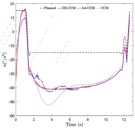 where is the basis function that is assumed to be known, and is th vector of unknown parameters. With the parametric structure (33), we designed two adaptive CCM controllers using and , respectively, where denotes the adaptive gain. Figure 5 shows the planned and actual trajectories under the CCM, Ad-CCM, and our proposed controller based on the RRE condition and disturbance estimation, denoted as DE-CCM, while Figure 6 and Figure 7 show the control inputs and Riemannian energy. One can see that the actual trajectories yielded by the CCM controller deviated quite a lot from the planned ones and collided with one obstacle. On the other hand, the actual trajectories yielded by the DE-CCM controller converged to the desired trajectory as expected and almost overlapped with it afterward. In fact, the slight deviations of actual trajectories from the desired ones under the DE-CCM controller were due to the finite step size associated with the ODE solver used for the simulations (see Remark 6). Table 2 shows the MSE for state trajectory tracking defined in (32). We observe that DE-CCM outperforms CCM and Ad-CCM in terms of MSE by 46% and 14%, respectively.