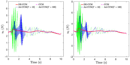 From Figure 6, one can see that the magnitude of under the RD-CCM controller decreased exponentially, and the magnitude was bounded by the curve from above except at the very end when the energy is close to zero. In comparison, Ad-CCM with yielded similar tracking performance to DE-CCM, while the tracking performance of Ad-CCM with was relatively worse and characterized by larger oscillations. Additionally, from Figure 7, one can see that the control inputs generated by both of the Ad-CCM controllers have high-frequency oscillations before 3 s, which is undesired for practical deployment. Finally, Figure 8 shows the actual and estimated disturbances as well as the estimation error. One can see that the estimated disturbance is quite close to the actual one for both channels, and the EEB of 0.1 is respected throughout the simulation.