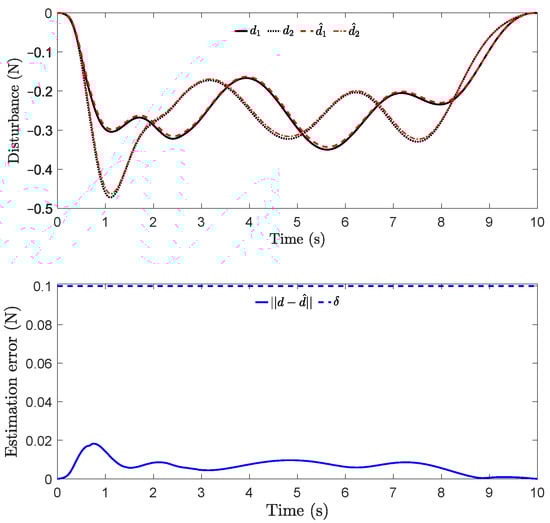 Actual and estimated disturbances (top) and the estimation error (bottom). Note that and () represent the ith element of d (actual disturbance) and (estimated disturbance), respectively. The blue dashed line in the bottom plot denotes the EEB used in computing the control inputs.