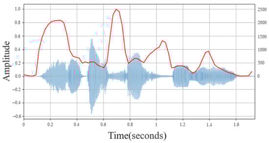 The spectral centroid [19] is an important parameter describing the characteristics of timbre. It is used to describe the frequency centroid of a sound signal in a spectrogram and can express the frequency distribution trend of each frame. The spectral centroid of each frame is drawn into a waveform graph. Figure 1 is a representation of the spectral energy distribution. Through the distribution of the overall average energy within a certain frequency range, it can be explained that the average value of the signal component frequency is biased towards high or low frequencies. In the physical sense, the spectral centroid can describe the brightness of a sound. When the sound is dark and deep, the frequency is more low frequency, and the spectral centroid is relatively low; when the sound is bright and brisk, usually concentrating on high frequencies, the spectral centroid is relatively high. The formula is shown in Equation (1), dividing the frequency spectrum into N frequency bands, where is the nth energy intensity (Magnitude) corresponding to the frequency f.