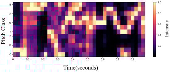 Chroma features describe, as a collective term, Chroma Vectors and Chromagrams. The chromaticity vector contains 12 elements, which are C, C#, D, D#, E, F, F#, G, G#, A, A#, and B. These elements represent the energy of the 12 sound levels in a period (such as one frame). The energy of the same sound level for different octaves is accumulated, and the chromaticity map is the chromaticity vector sequence. The twelve equal temperament is a method of using equations for musical rhythm [23]. The chroma vector is composed of a vector of 12 element features, used to represent the energy in each scale in the signal. The visualized Chromagram is shown below Figure 2: