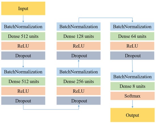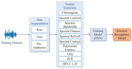 The main concept of this research is to extract the acoustic features of Chinese speech for sentiment analysis and classification. Using the method of sound rotation and sound frequency modulation, amplify the training samples and extract 29 acoustic features from the sound signal, and input the DNN model proposed in this research for training. The system architecture is shown in Figure 3. Due to the shortcomings of the Chinese language and corpus, this study designed two algorithms for augmenting data. This research first divides the collected voice emotion dataset into training data and test data and increases the amount of voice emotion data through two voice data extension methods. As such, 29 voice features are extracted, respectively: “Chroma Feature”, “Spectral Centroid”, “Spectral Bandwidth”, “Spectral Flatness”, “Spectral Roll-off”, “Spectral Contrast”, “Polynomial Features”, “RMSE”, “ZCR”, and “MFCC 1-20”. Finally, the classification result is obtained through the proposed DNN model.