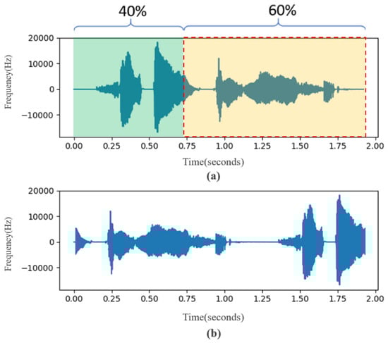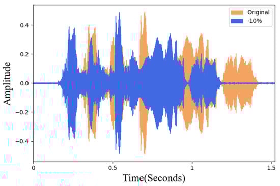 In this study, different degrees of sound rotation and two pitch adjustments were tested. In order to avoid the difference between the new data and the original data being too small, the sound rotation was taken as a unit of 10% and 10~90% was performed, respectively. Figure 5a is the waveform of the original data and Figure 5b is the waveform after 60% rotation. In sound frequency modulation adjustment, this research uses 5% as a unit to adjust the frequency amplitude. To maintain the natural intelligibility of the adjusted data, after the actual listening test, the maximum value can be adjusted to 30%. Therefore, frequency modulation processing of plus or minus 30% is carried out, respectively. Figure 6 is a waveform diagram of the comparison of the 10% frequency reduction in the original data. In Figure 6, the orange sound wave represents the original data and the blue is the data processed by frequency modulation.