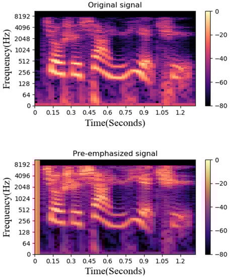 - Pre-emphasis: The signal is pre-emphasized, and the voice signal is passed through a high-pass filter, as in Equation (5), where is the output signal, is the original signal, and the value of is usually between 0.9 and 1.0; in this study, the default was 0.97. Pre-emphasis will boost the high-frequency part and flatten the spectrum of the audio, maintaining it in the entire frequency band from low to high frequencies, using the same signal-to-noise ratio to obtain the spectrum.