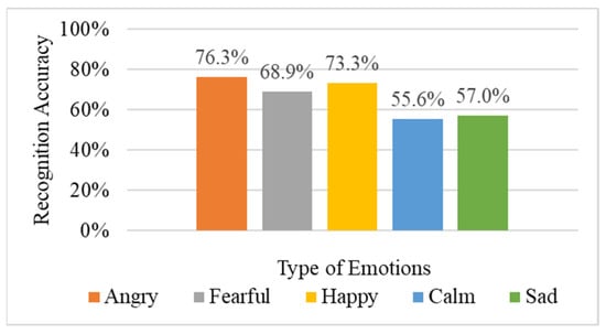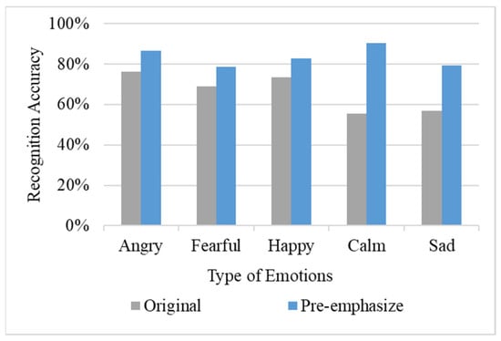 Subsequently, this study used the pre-emphasis method to expand the data size to 2400; the results are shown in Figure 10. The results show that the pre-emphasis method has a significant increase in the recognition accuracy of each emotion and the average recognition accuracy is increased to 83.6%. Table 1 shows the test results of pre-emphasized data, especially the recognition accuracy of ‘Calm’ and ‘Sad’, which rose to 80%. The recognition errors caused by unobvious features were improved by the pre-emphasis procedure.