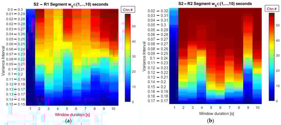 In this sense, sorting the segment durations that are masked out by the percentage thresholds allows us to identify common durations covered by the area of the PDF bounded by the interval limits. As result, we obtain a series of segments that are ordered by both the duration and the relative variance magnitude that they exhibit; this information is used to categorize them accordingly. Then, counting the segment durations that are found at a specific percentage threshold quantifies the number of channels that share similar stationary properties according to their kurtosis variance magnitudes, and, if a cutoff value is established to set a limit on the minimum number of channels expressing the Kσ2 values within a percentage range, then the searching strategy returns the segment durations meeting these requirements. In this way, the searching strategy shows the segment durations that, at a specific percentage threshold, gather the required number of channels exhibiting similar stationary characteristics. In these terms, the trade-off is solved by performing the selection of the segment length with the lowest percentage threshold reaching the minimum requirement for the number of channels.