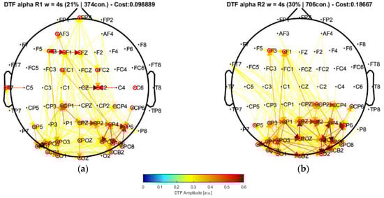 As explained previously, effective connectivity is more noticeable in the posterior areas as evidenced by the increased network cost for the closed-eyes condition compared with the open-eyes case. These are characteristics expected from the alpha frequency components obtained from acquisition settings like ours. Of note, analyzing active thinking or the engagement of cognitive tasks (more noticeable over the beta frequency band (13–40 Hz)), despite being important, is out of the scope of this work, mainly due to the nature of the EEG signals at our disposal, and that our application example was defined to have a glance at the EC results that could be obtained after applying our methodology, from which we obtained consistent results.