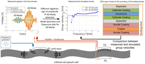 Furthermore, with this workflow, the proposed simulation model shown in Section 5.3 can be used to determine the mechanical properties of an LIB. This can be done by comparing the measured dispersion plot, which shows the dispersive behavior of the Lamb wave, with the simulated dispersion plot. By knowing the dispersion plot of an LIB, a specific Lamb mode can be tracked.
